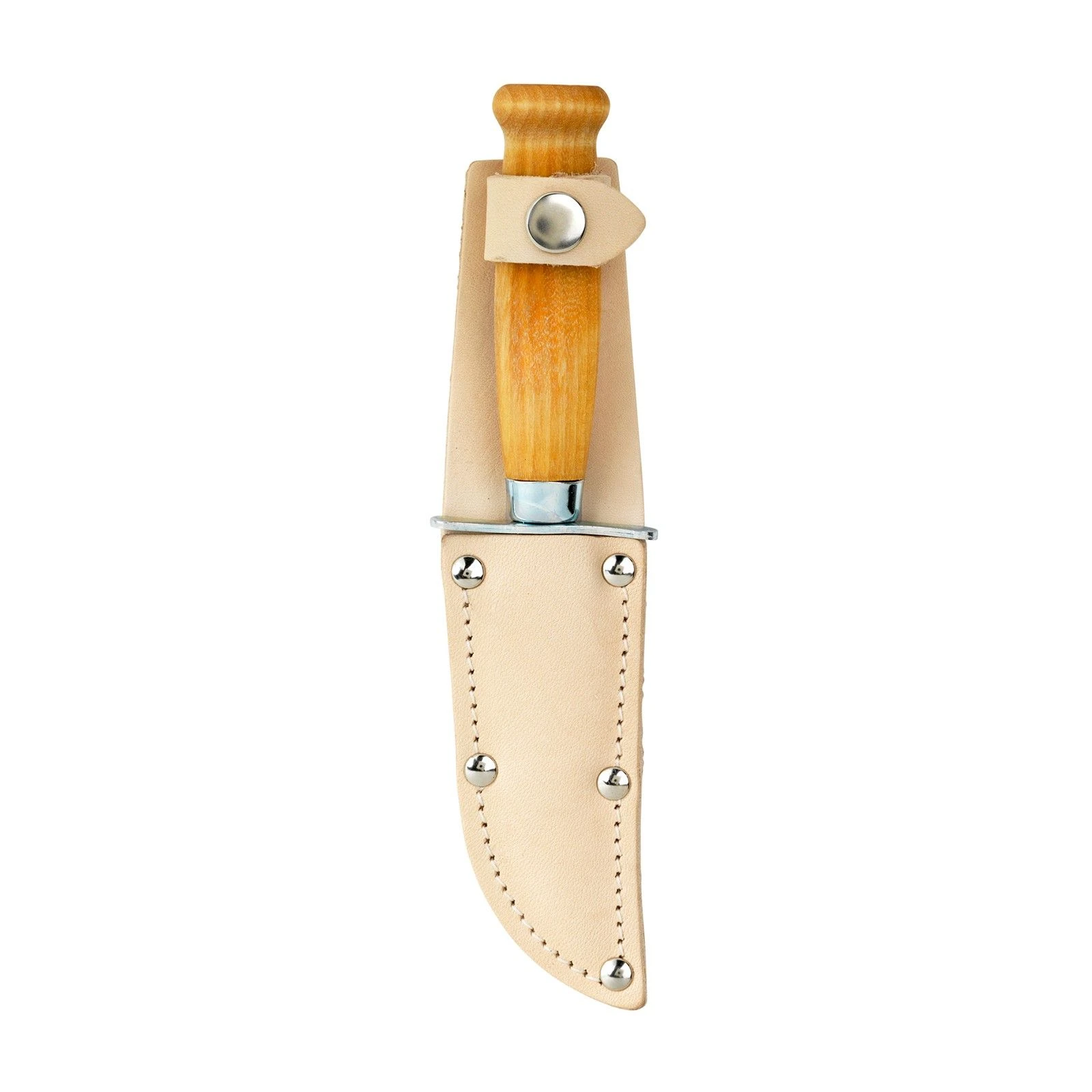 Kniven har rustfrit blad, skaft i bøg og lys læderskede.