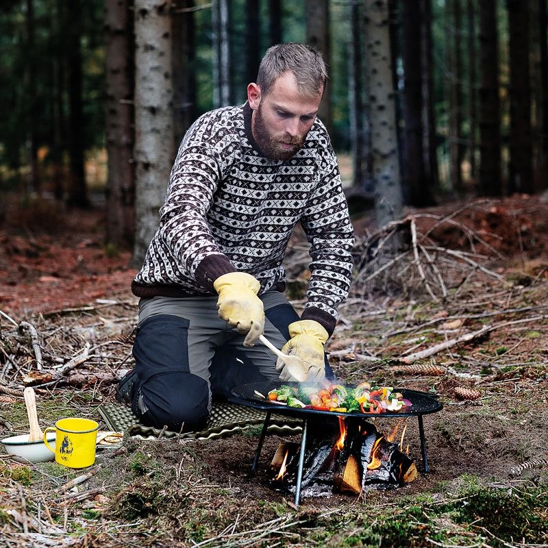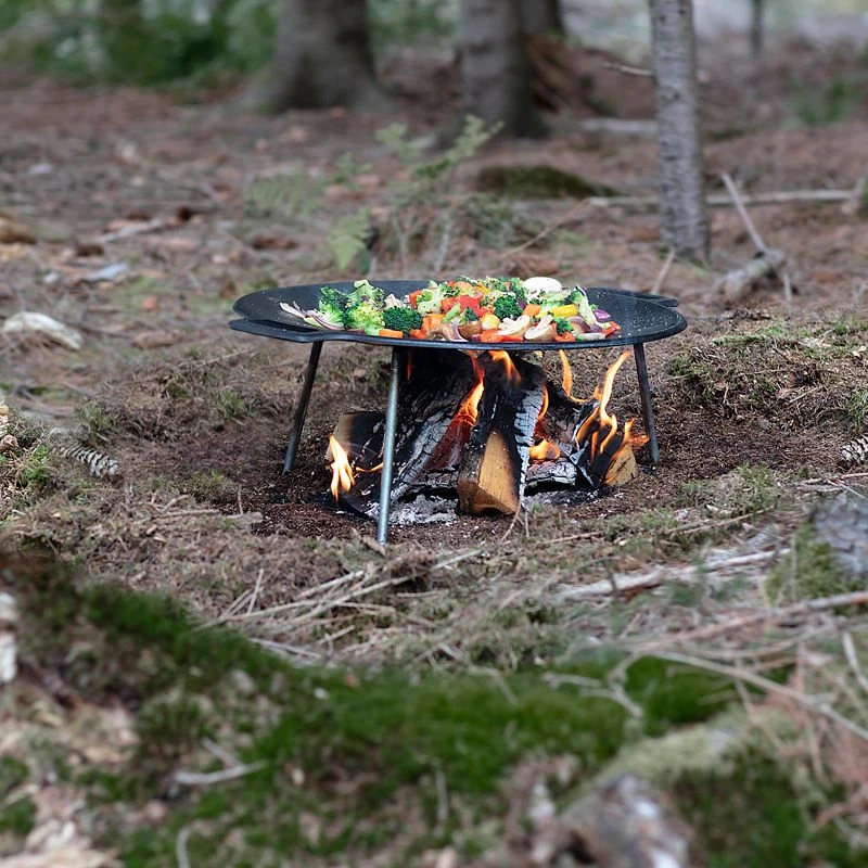 Den robuste stegeplade er svagt skålformet, så væsken fra stegningeen samles i midten og dit kød ikke kommer til at stå og ”koge”. Den er forsynet med 3 gode faste ben, der giver god stabilitet, når den står i bålet og har to gode håndtag, så den er nem at håndtere.
