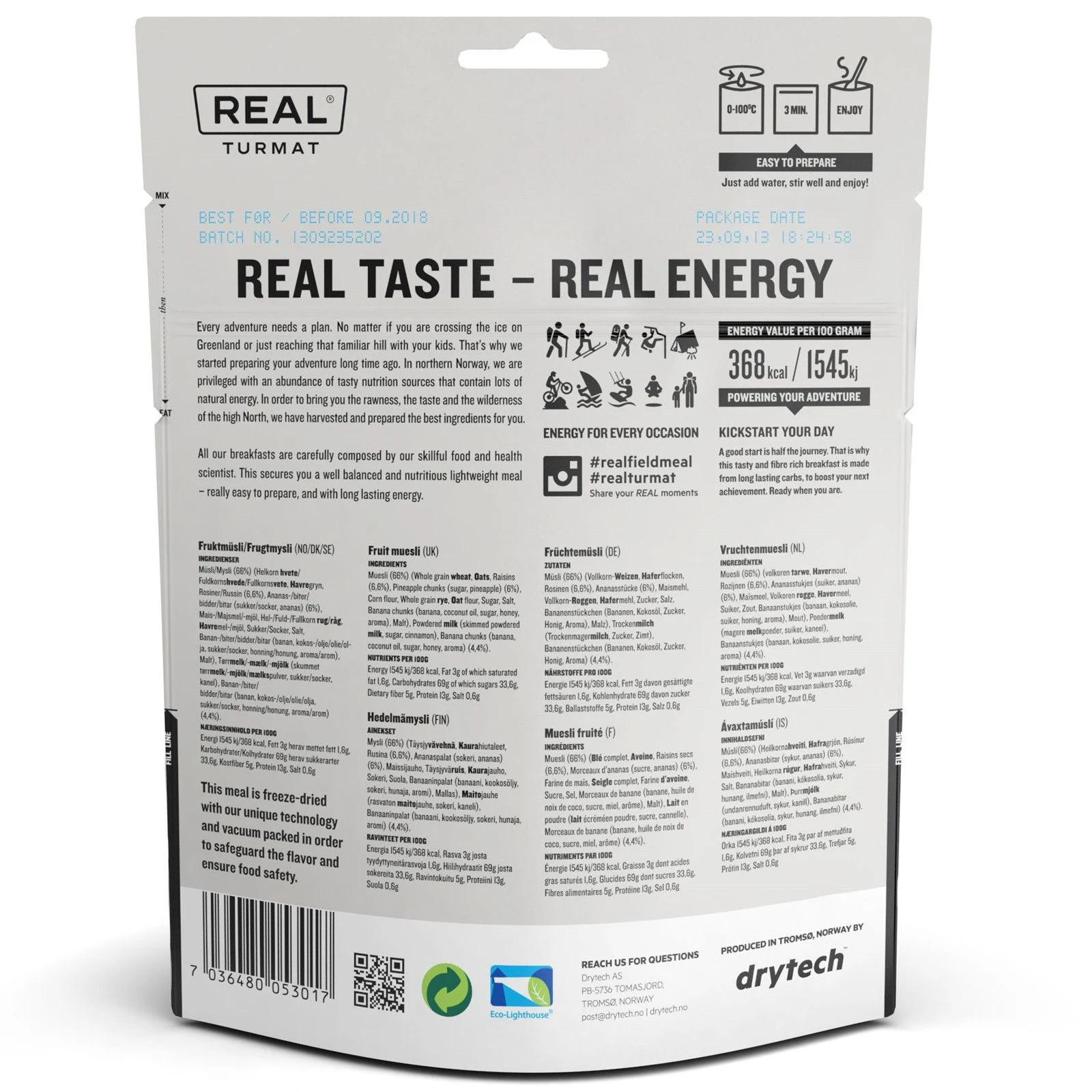 Vægt: 113 g. Energiindhold: 368kcal/100 g. Total energiindhold: 416kcal. Vegetar Ingredienser: Müsli (66%) Fuldkornshvede, Havregryn, Rosiner (6,6%), Ananasbidder (Sukker, Ananas) (6%), Majsmel, Fuldkorns rug, Havremel, Sukker, Salt, Malt, Tørmælk (Skummetmælkpulver, Sukker, Kanel), Bananbidder (Banan, Kokosolie, Sukker, Honning, Aroma) (4,4%) Næringsindhold pr. portion: • Fedt: 3 g • Kulhydrater: 78 g • Kostfiber: 6 g • Protein: 15 g • Salt: 0,7 g