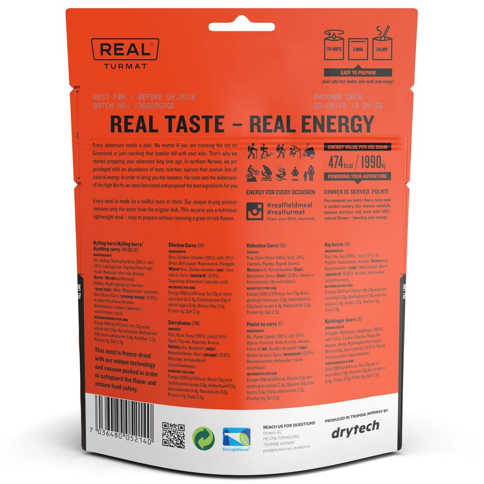 En lækker portion ekspeditionsmad med masser af smag og energi. Kylling i Karry er en meget lækker ekspeditionsret, som kombinerer følelsen af ”rigtig” mad med med lav vægt, meget højt energiindhold og uhyre nem tilberedning. Retten indeholder bl.a. ris, kylling, karry og hvedemel hvilket giver den en meget kraftig, men meget lækker smag. Retten er ideel at tage med på tur da man kun skal tilsætte kogende vand for at tilberede den. Man hælder det kogende vand ned i posen og lader retten trække i 8 minutter. Resultatet bliver bedst, hvis man spiser direkte af posen, da den holder bedst på varmen.