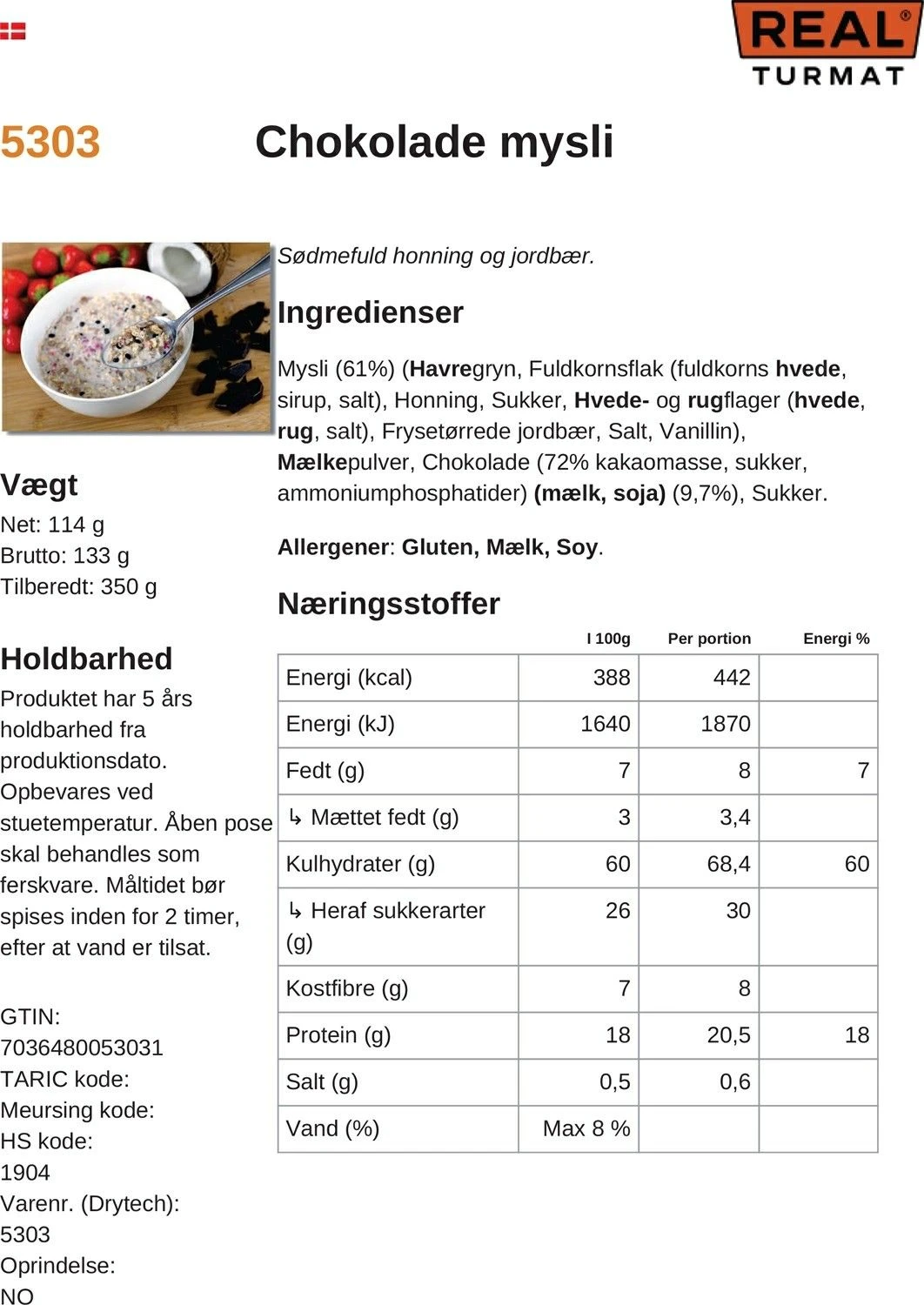 Retten har et meget alsidigt indhold og indeholder bl.a. havregryn, chokolade, fuldkornsflager, ristede hvede-rugflager, jordbær, tørmælk, honning, sukker og vanilje. Der skal blot tilsættes vand, så har du en lækker portion morgenmad, der både har rigtig god smag, konsistens samt giver en god start på vandre- eller skituren.
