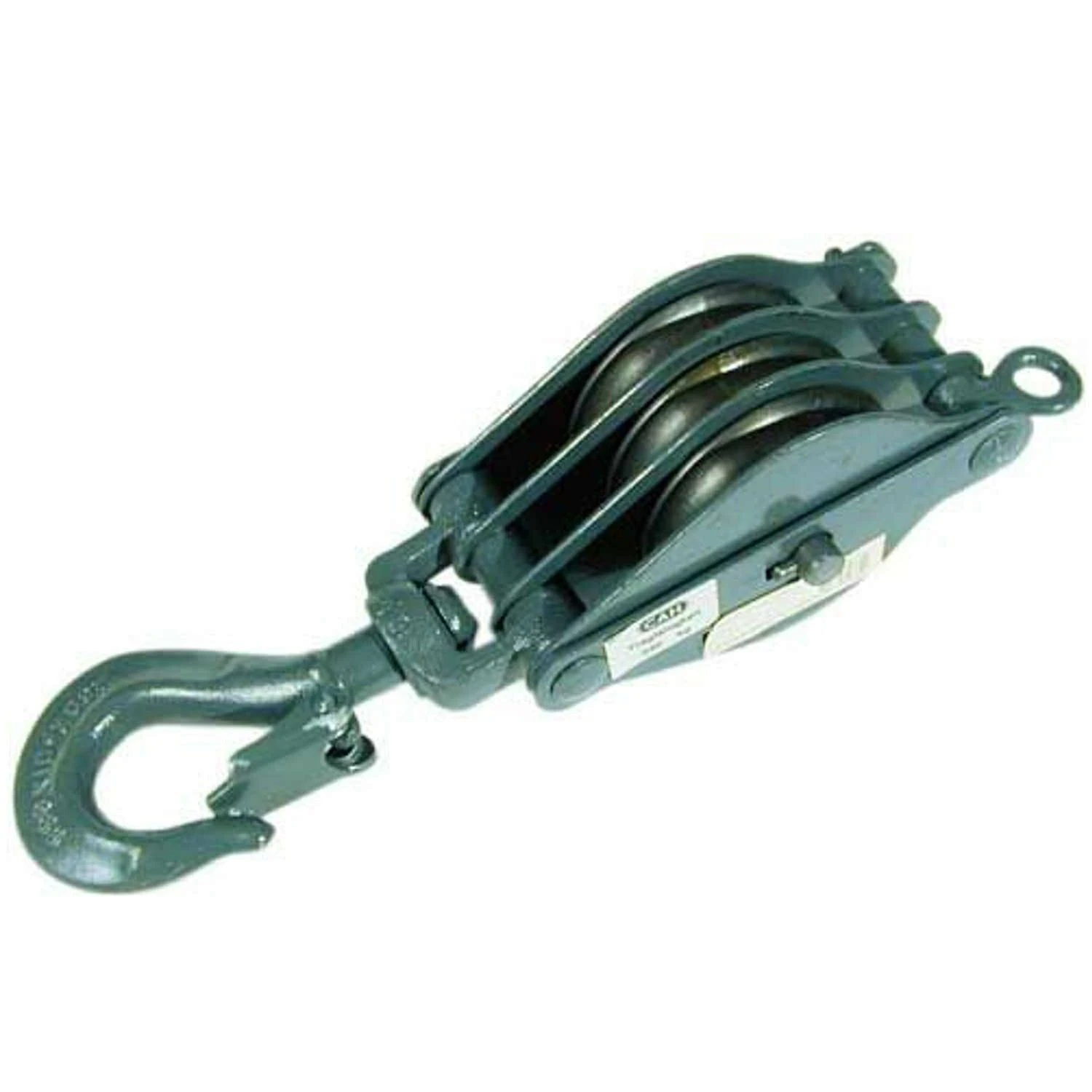 Taljeblok med tre 60 mm skiver. Uundværlig til større pionerarbejder, hvor man hurtigt kan løbe tør for kræfter. F.eks. ved opstramning af tovbaner, etablering af anker, eller løft af store og tunge emner. Detaljer: • Selvlåsende krog • 3 skiver • Maksimal rebdiameter: 11 mm. • Maksbelastning: 150 kg. Hvis du har behov for at vide noget omkring CE mærkning og londonblokke / taljer, så kan vi anbefale Europa-Parlamentets og Rådets direktiv 2006/42/EF. Formegentligt vil artikel 24 være mest relevant, her står lidt omkring undtagelsen af tovinstallationer og svævebaner.