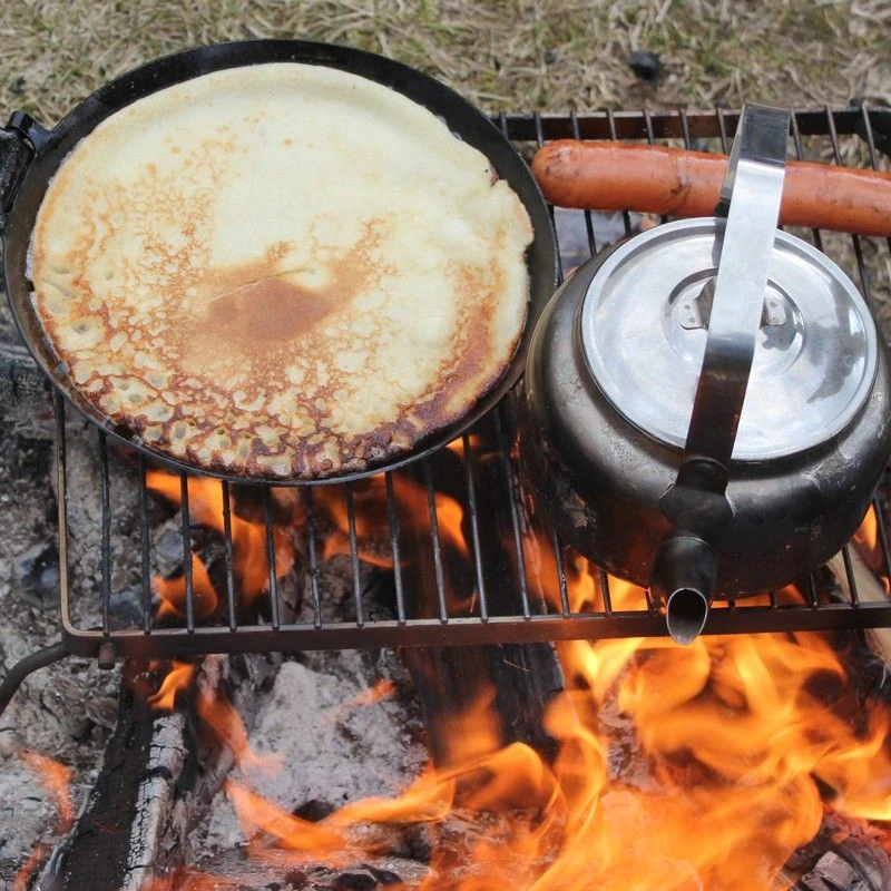 BBQ har foldbare ben, så den er at folde sammen og transportere til lejrpladsen. Når I er fremme og har fået fyret godt op i bålet, placeres risten nemt i gløderne, hvor den både fungerer som en klassisk grill til kød, pølser og grønsager eller som en et godt stabilt underlag til potter og pander, så gryden med pasta ikke vælter og ryger i bålet.