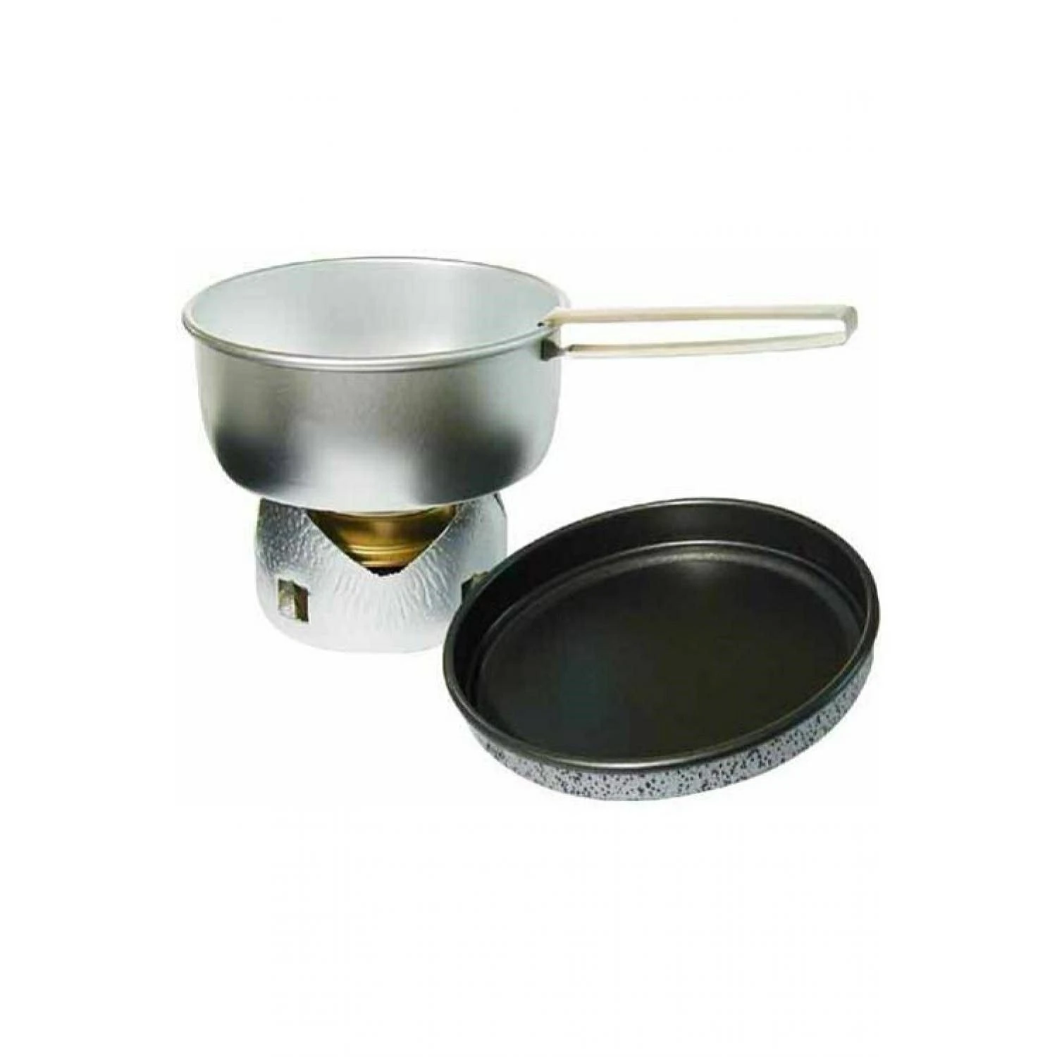 - Sættet indeholder: 0,8L gryde, teflonbelagt pande, spritbrænder, vindskærm og håndtag