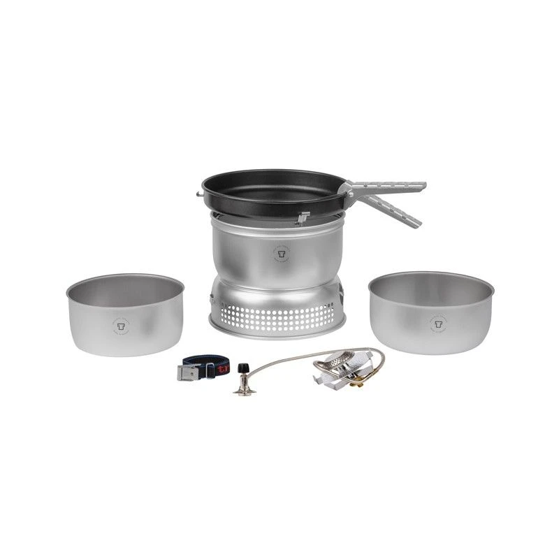 Trangia 25-23 UL (Ultra Light) / Doussal er den klassiske Trangia med alle de gode egenskaber, du kender i forhold til stabilitet og varmeudnyttelse men opgraderet med gasbrænder, robuste gryder i rustfrit stål og nonstick pande / låg