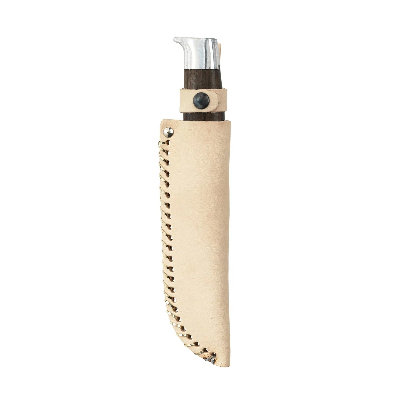 Skeden er fremstillet i kraftigt kernelæder, øverst i skeden er sat en lille pal, der går ind i skaftet, når kniven sidder i skeden og sikrer dermed, at den ikke hopper ud, når der er gang i den på natløb m.m..